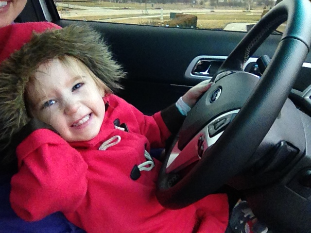 Okay, so yesterday I decided to make a probably poor (but fun) parenting decision. Our mailbox is at the front of our sub. Once all the houses are done being built, then we will get a mailbox at each house. Until then, to the front of the sub we go. So, yesterday I was expecting something in the mail and wanted to go check the mailbox. I asked you if you wanted to sit on my lap and drive down there…. !!! Your eyes lit up like Christmas morning and you ran to get dressed! Excited is an understatement. We decided, Molly, you would drive to the mailbox, then, Maddy, you could drive home. We barely got out of the driveway when, Molly, you said the steering wheel was too cold for your hands. It was pretty cold out that day. I guess we should have brought gloves. Oh, well… next time. So, we pulled over and switched. Maddy, when you got to the drivers seat you were squealing with excitement! I was cracking up at your driving skills… I really hope none of our neighbors were looking out their windows because they would have thought I was drunk at 10am! Molly, you were being a total nut and dancing crazy in the passenger seat. You guys are too much fun. Anyways, we got the mail, we drove home and you made me promise that you could drive to the mailbox again one day. So, I promise, you can do it again.