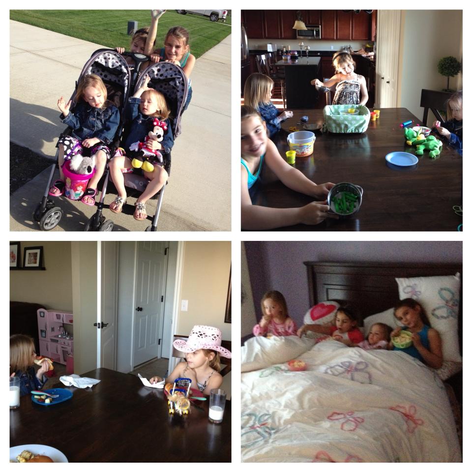 Now, on a normal night you go to bed at 7:30pm. On the dot. This night, you were up til 10:30 and finally you were getting crabby and exhausted. You were so tired, you didn’t even put up a fight when I said you had to go upstairs. You both feel asleep rather quickly! The next morning came way too soon- all four of you girls were up at 7:30am! Daddy made us all a big breakfast- cheesey eggs and french toast and strawberries- and we played outside til Kay and Gracie’s mom picked them up.