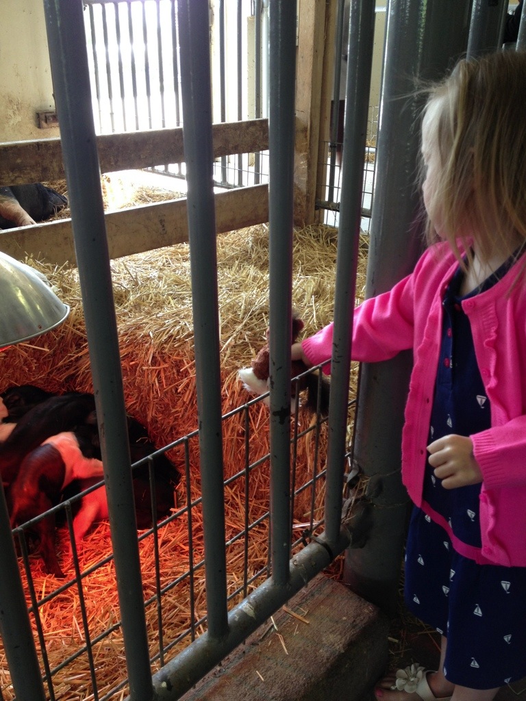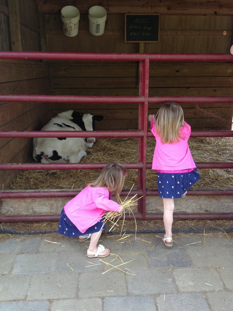 First, we went to the farm. We got there just as a liter of piglets were being born. They were super cute! Molly, you love the baby goats. You yell at them to come over to you so you can hug and kiss them. Mandy, you enjoy them too. Your other favorite animal is Noel, the cow that was born on December 6th. She eats hay right out of your hand and you couldn’t believe how hard and “scratchy” her tongue is. The horses there are also beautiful!