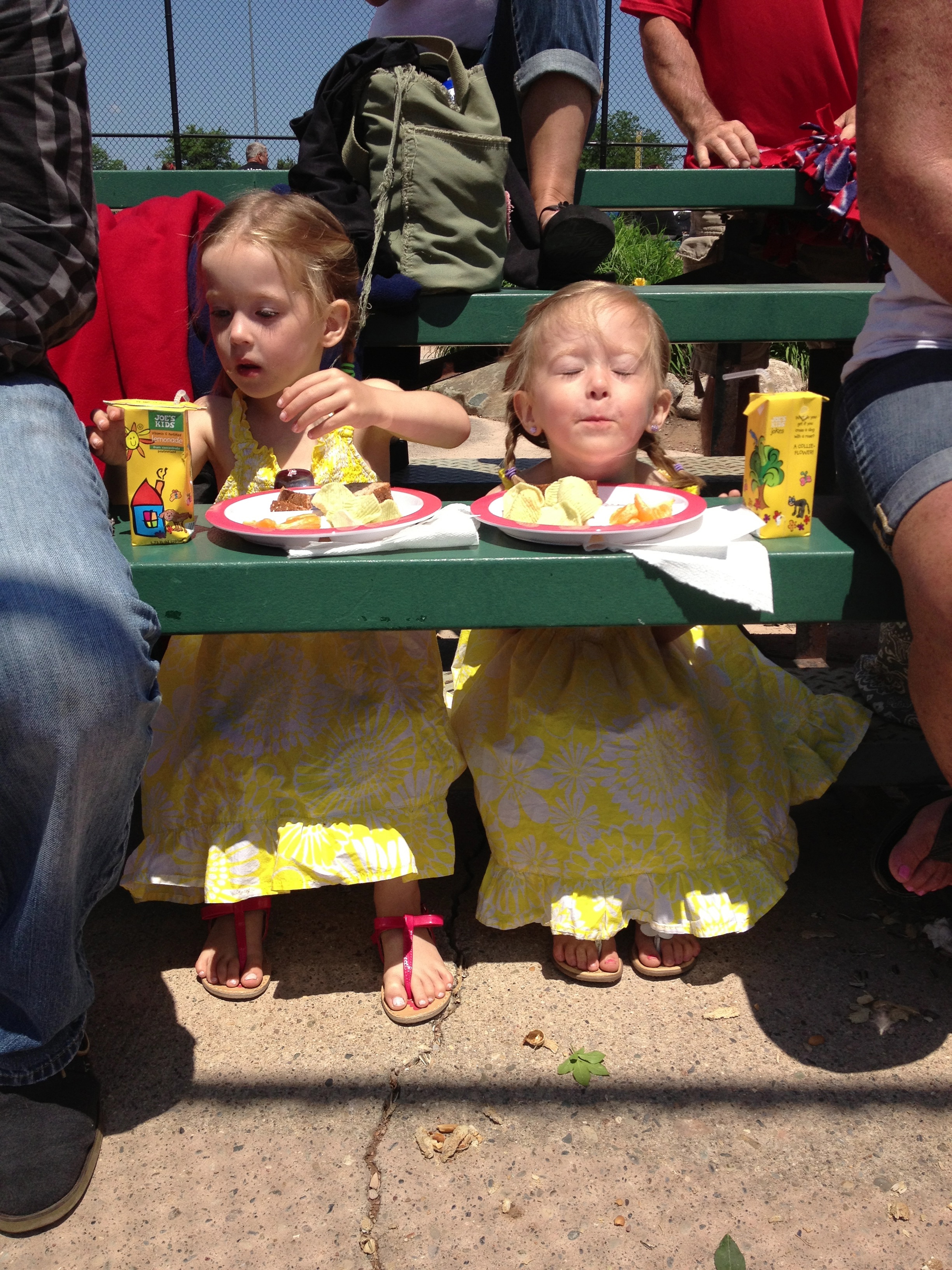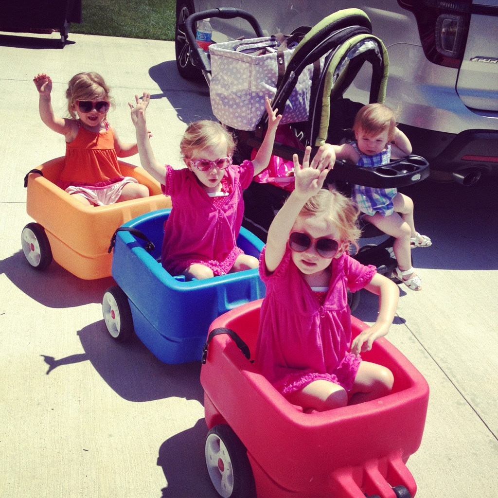We started off with a visit from our friends- Ms Carmen, Carley and and Sammi. They were in the area and stopped by to say hi. We invited them to come with us to a party- a first annual End of the School Year Party for our subdivision. We were really looking forward to it, and it turned out to be way bigger than I was expecting! Our sub is going up so fast that it feels like there are new kids moving in everyday! We met new neighbors, had hotdogs and lemonade and popsicles and brownies and fruit, played with water balloons, jumped in the bounce house, and just ran around like a bunch of crazy three year olds! We were having a great time until you both were gathered around a water table playing with toy sharks. A little boy walked up with a water gun and squirted you guys. He was probably only two or so, he didn’t know any better… he was just watching the big kids have a water gun fight and thought it was fun. Well, Molly- you didn’t think it was so much fun. Despite the fact that you were wearing a bathing suit, you weren’t enjoying getting splashed/squirted. I didn’t really blame you; it was kind of frustrating. After getting visibly irritated a few times, you finally had at him!