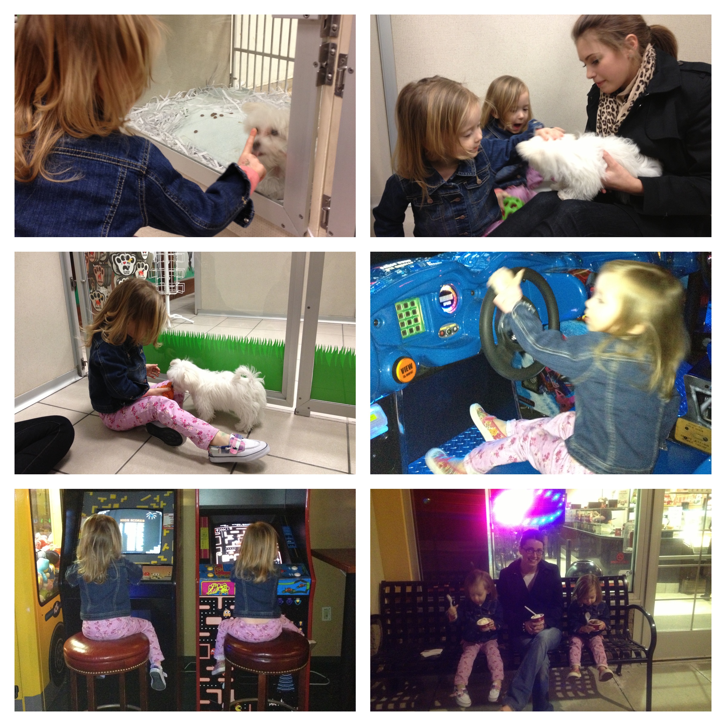 After dinner we headed to Fountain Walk. We went to the pet store and, Maddy, you fell in LOVE with a puppy! I was surprised because you both are normally pretty scared of dogs. But not this little white fluffy puppy! You giggled and played with it for awhile and wanted to take it home so bad. But, I was able to convince you the doggy needed to go to bed and I promised we’d come back to see it.